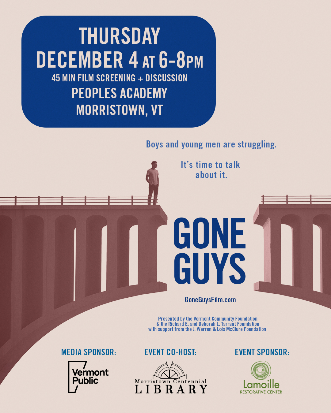 This event has passed.Gone Guys 45 Minute Film Screening + Discussion December 4, 2025 6:00 pm - 8:00 pm Peoples Academy Morristown, VT, 05661, United States, + Google Map